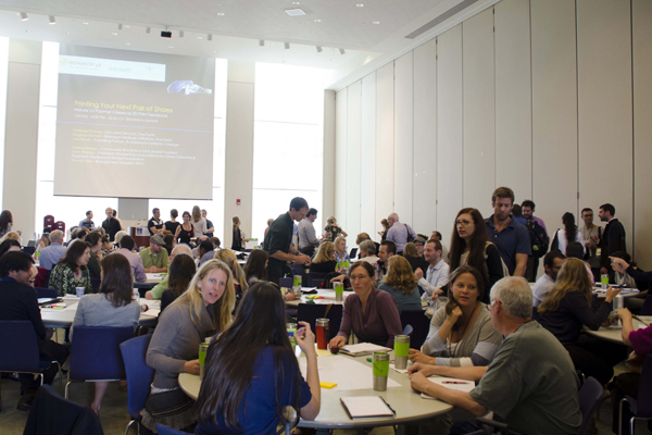 2日目はマサチューセッツ工科大学メディアラボのネリ・オクスマン先生が研究する「マテリアル・エコロジー」が紹介されました。これは自然界で見られる、エネルギーが低い生産プロセスや、資源循環をモデルにしたプロダクトを作る試みです。特にオクスマン先生は、生物学的な材料や化学、構造に着目しています。この実験的な研究は、最新のデジタル工作機器を用いて初めて可能になることも言及されました。特に3Dプリンタは、数種類の材料で多様な機能を生み出すことができます。さらに出力された製品は容易にアップサイクルされます。この特徴は生物学的な生産技術体系と類似するため、新しい生産手法として会場から大きな関心が寄せられました。