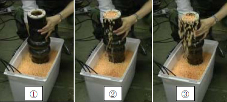 そこで、本研究では、腸管の蠕動運動による搬送を人工筋肉によって実現することで、様々な流体を垂直搬送に成功した。一例として図5に固体含有率30%のときの固液体混合流体を垂直搬送している様子を示す。現在このポンプは、固体ロケットの推進薬を作成・搬送する装置や汚泥搬送、セメントの搬送など幅広い分野での応用が期待されている。
