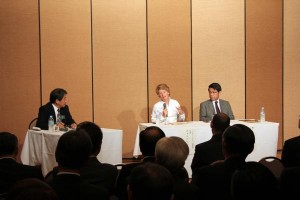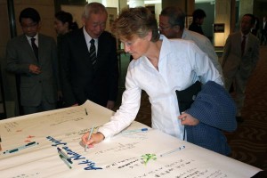 「バイオミミクリー」提唱者で、アメリカのバイオミミクリー研究所代表のジャニン・ベニュス氏を招き、2011年10月アスクネイチャー・ジャパン連携協定調印式を開催しました。バイオミミクリー研究所のほか、近江八幡市、滋賀経済同友会などから産官学民の参加をえて、連携協定を締結しました。